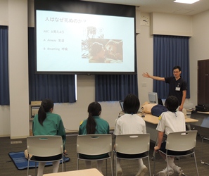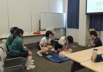 写真は、AED(自動体外式除細動器)の操作を医師から学んでいるところ。将来の夢が看護師という方もいて、皆さん、一生懸命に取り組んでいました。未来の夢に向かって、ぜひ頑張って欲しいです!