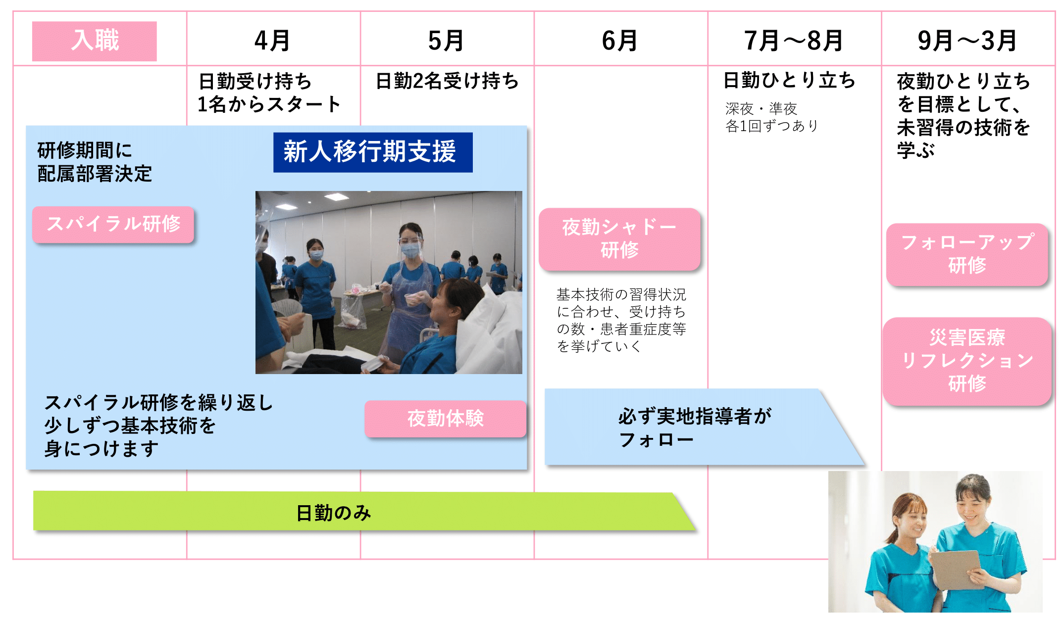 新人看護師を支援し、味方となって段階的に振り返りをしながら、助言したり相談に乗るなど1年間に渡って新人の支援をします